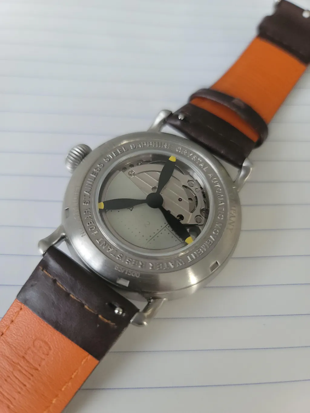 The Ferro & Company AGL-2 24H boasts a robust Japan Automatic Movement Caliber 8217, ensuring lasting reliability and impeccable timekeeping precision. It features a 24-hour sub-dial at 9 o'clock and a gracefully curved date window at 3 o'clock. Notably, the AGL 2 Caliber 8217 watch is adorned with an intricately decorated rotor, while its back case pays homage to the timeless aesthetics of vintage planes like the Supermarine Spitfire with a fixed propeller design