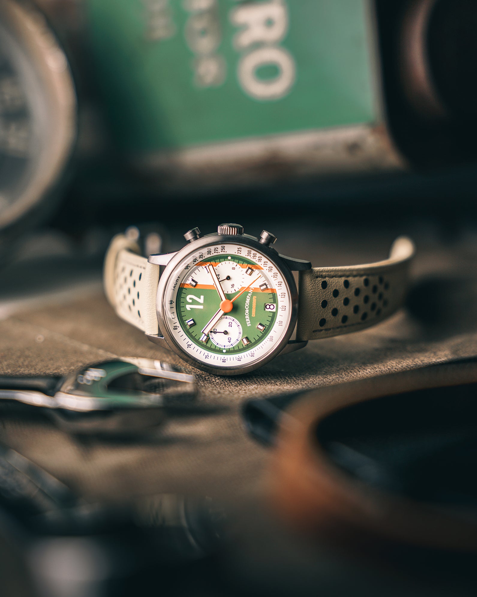 One of the most popular racing color themes in history. Inspired by classic Gordon Bennett Cup. They bring memories and evoke nostalgia. Ferro & Company is all about retro stye watches. Historic racing watches, especially.