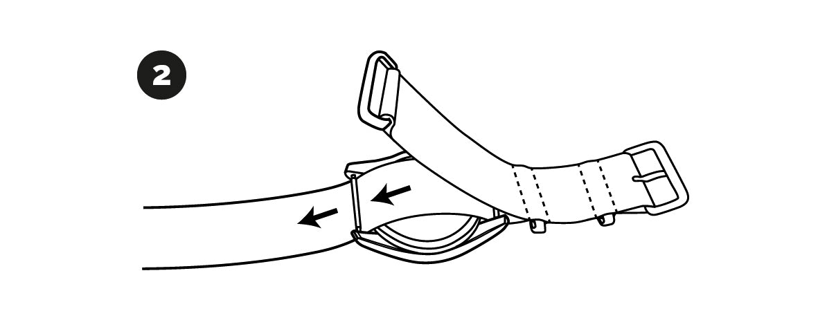 The Nylon strap's buckle side should be on the 12 o'clock side of the watch. Next, slide the strap tip through the spring bar and the watch's case.