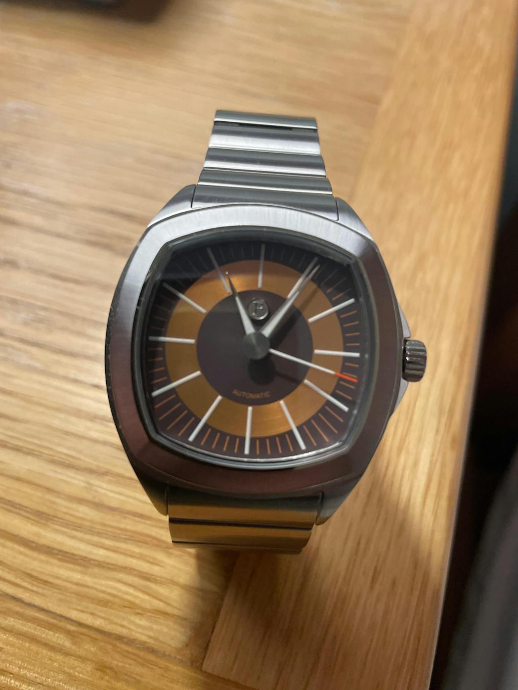 I like the weight and feel of the watch and the dial is interesting although some imperfections on the orange minute and hour hands it almost appears as though there’s a white dot or something on both of those hands. I expected better quality control at this price point.