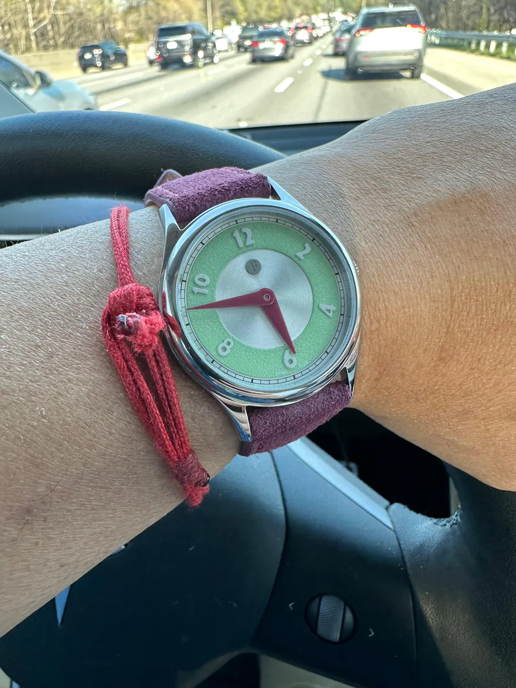 The green circle has a jade feel to it and hands just pops in contrast. Dial color combo allows this dressy piece to be a strap monster to dress up or down the piece