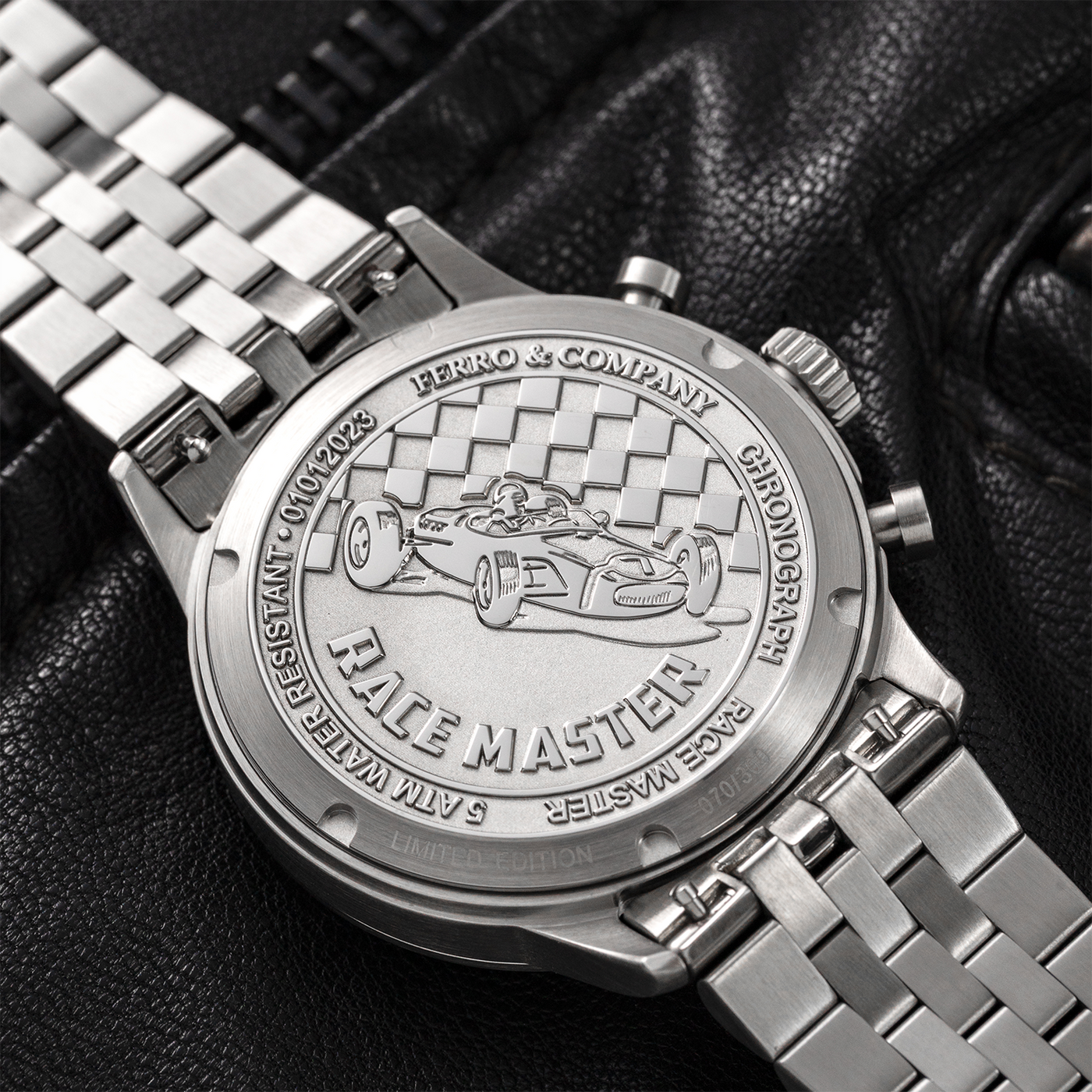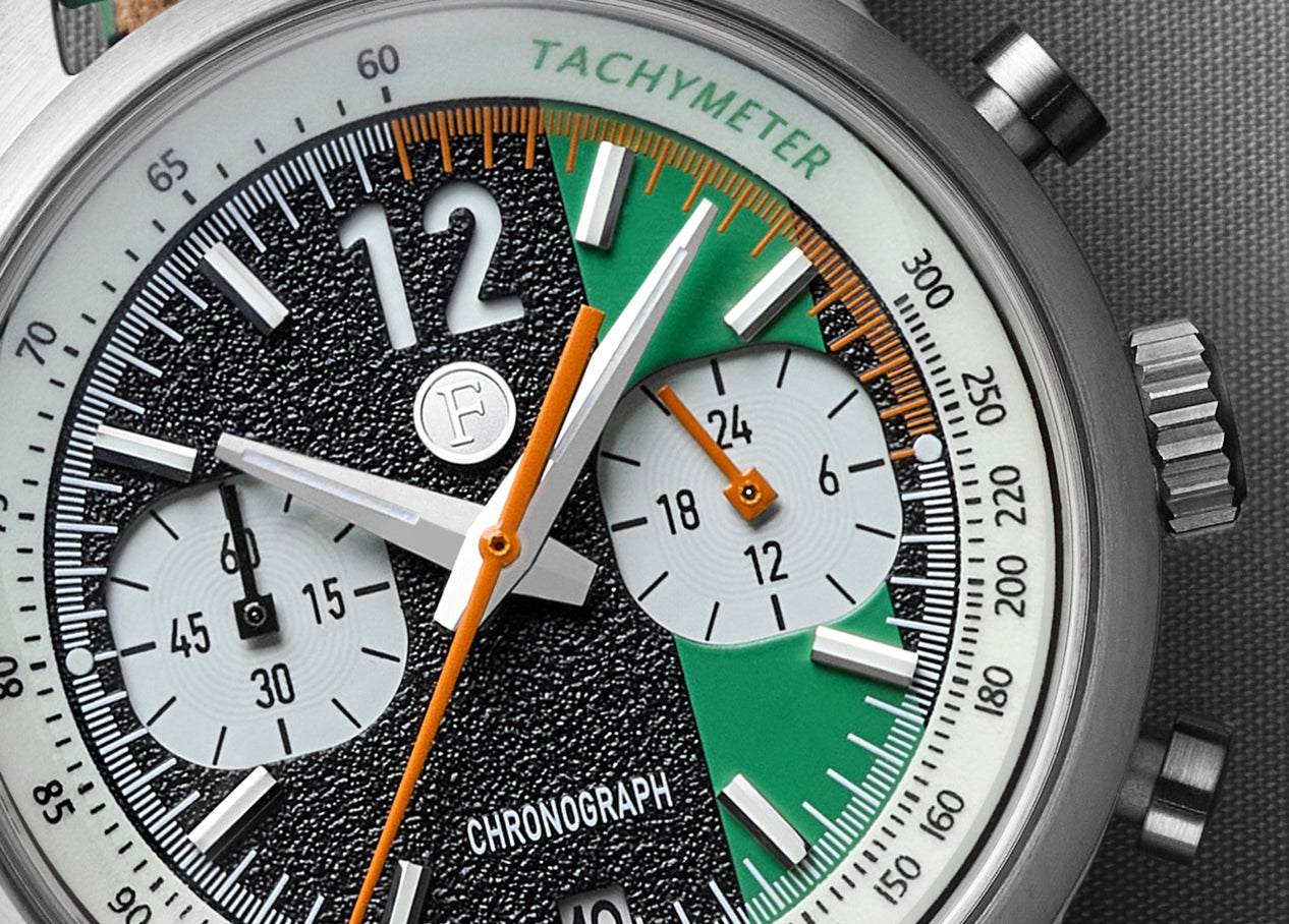 Every Race Master watch is a testament to craftsmanship and precision. Its three-layered dial with a unique asphalt-textured finish captures the raw spirit of the racetrack, while the metal logo emblem and applied indices with Super-LumiNova lume bring depth and brilliance to every glance. Protected by a German-made Hesalite box crystal, it offers a warm, distortion-free view — a perfect blend of vintage charm and modern resilience for those who live for the thrill of detail.